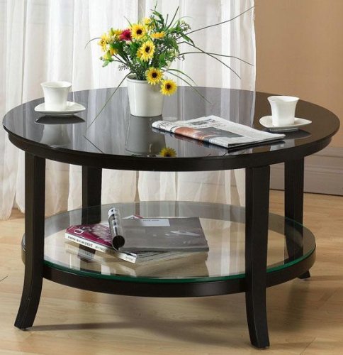 The streamlined design of this round coffee table coordinates beautifully with most decorating styles. Clean lines and minimal details are utilized for a simply handsome style. Place your order today.This coffee table features a durable, black-finished wood frame.It has a glass top and shelf.The glass top has a black paint underlay. Actual size is 31.5"W